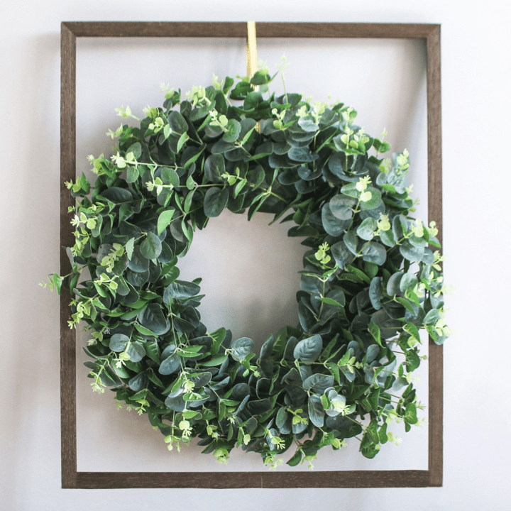 Artificial eucalyptus wreath features many neatly trimmed green leaves that are arranged together in a circular formation.